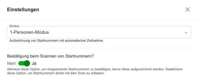 Zudem kann über die zweite Einstellungsmöglichkeit „Bestätigung beim Scannen von Startnummern?“ nun kontrolliert werden, ob beim Einscannen von Startnummern via Bibcodes eine Bestätigungsmeldung auftauchen soll oder nicht. Dies war bisher standardmäßig immer der Fall.