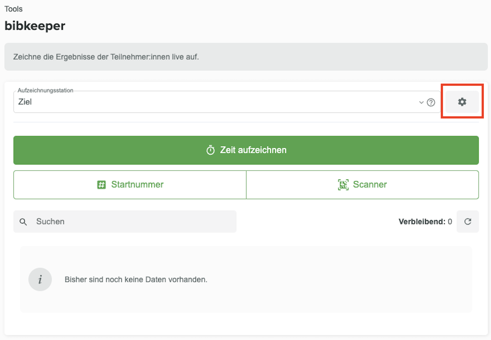 Um den Modus für die Zeitnahme zu wechseln, klicke einfach auf den Button mit dem Zahnrad neben dem Auswahlfeld für die Aufzeichnungsstation: